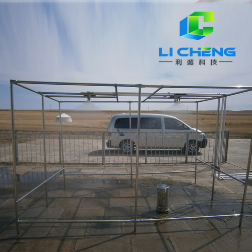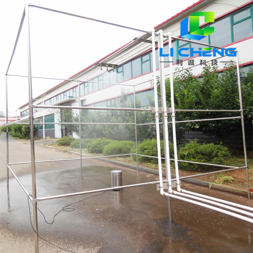 噴霧單元由供水管路、直管段、噴嘴、支架等組成,噴嘴采用世界上專業生產模擬雨滴噴頭的美國SPAYING SYSTEMS公司生產的FULLJET旋轉下噴式噴嘴,不銹鋼材質,噴嘴和直管段集成在一起,噴霧支架為不銹鋼方管結構,用來架設供水管路和噴嘴。